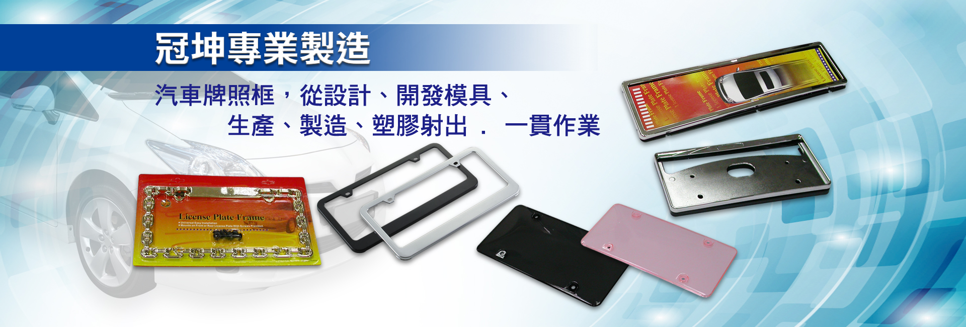 冠坤企業有限公司成立於西元1989年,位於台南縣。本公司專門從事汽車百貨精品,從設計、開發模具、生產、製造、塑膠射出、行銷等一貫作業。產品涵蓋汽車專用牌照框、飲料架、CD袋、椅背置物袋、裝飾天線及其他各種汽車百貨類的用品均可生產,亦可接受OEM訂單。